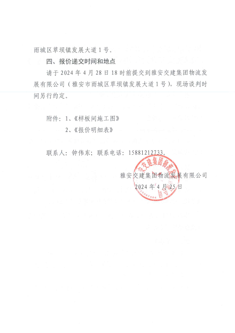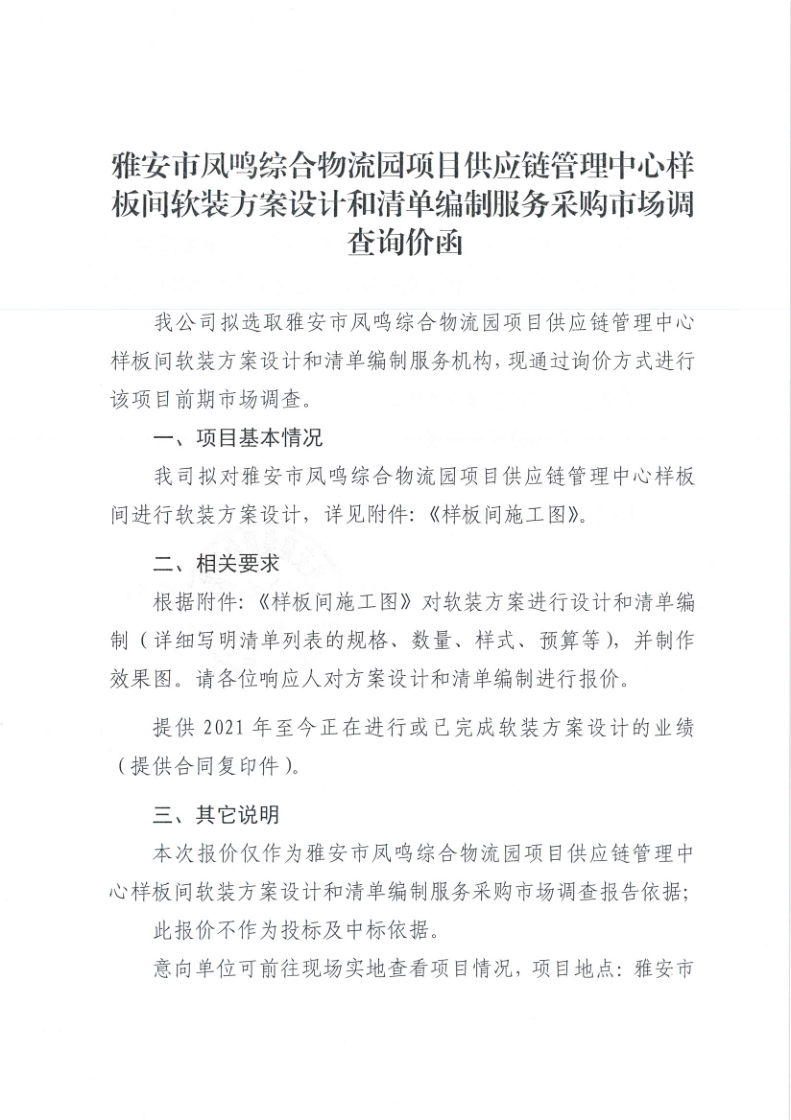 雅安交建集團物流發(fā)展有限公司雅安市鳳鳴綜合物流園項目供應鏈管理中心樣板間軟裝方案設(shè)計和清單編制服務采購市場調(diào)查詢價函