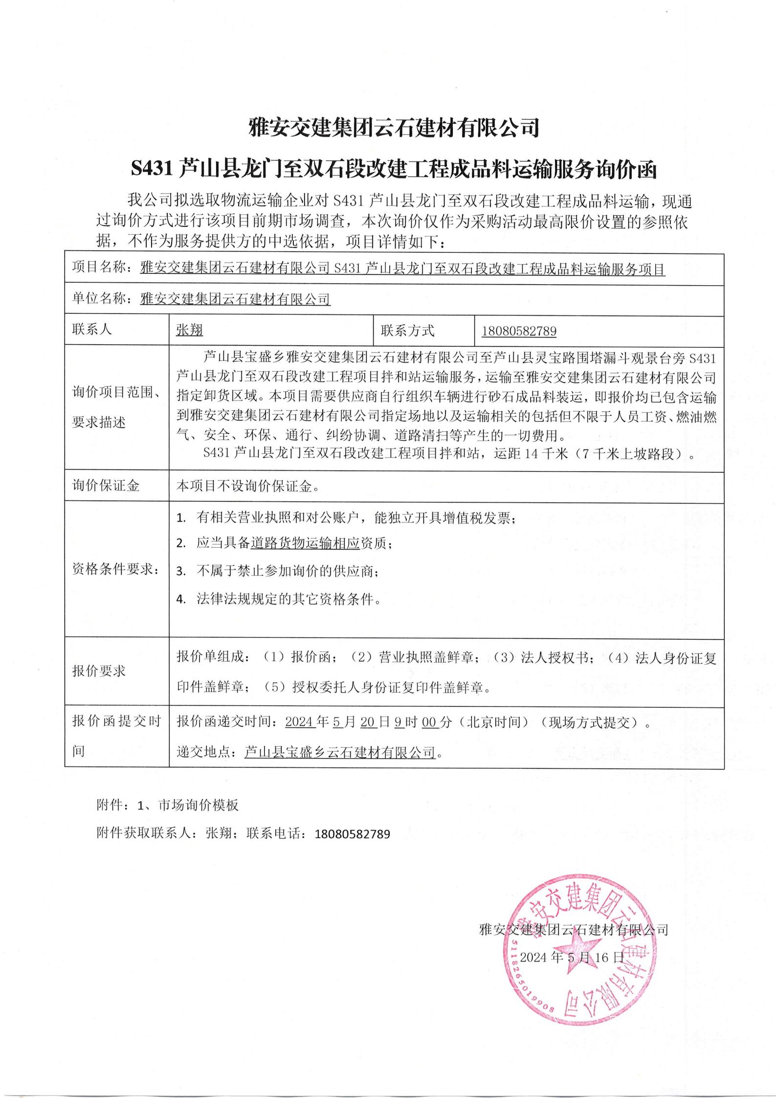 雅安交建集團云石建材有限公司S431蘆山縣龍門至雙石段改建工程成品料運輸服務項目詢價函