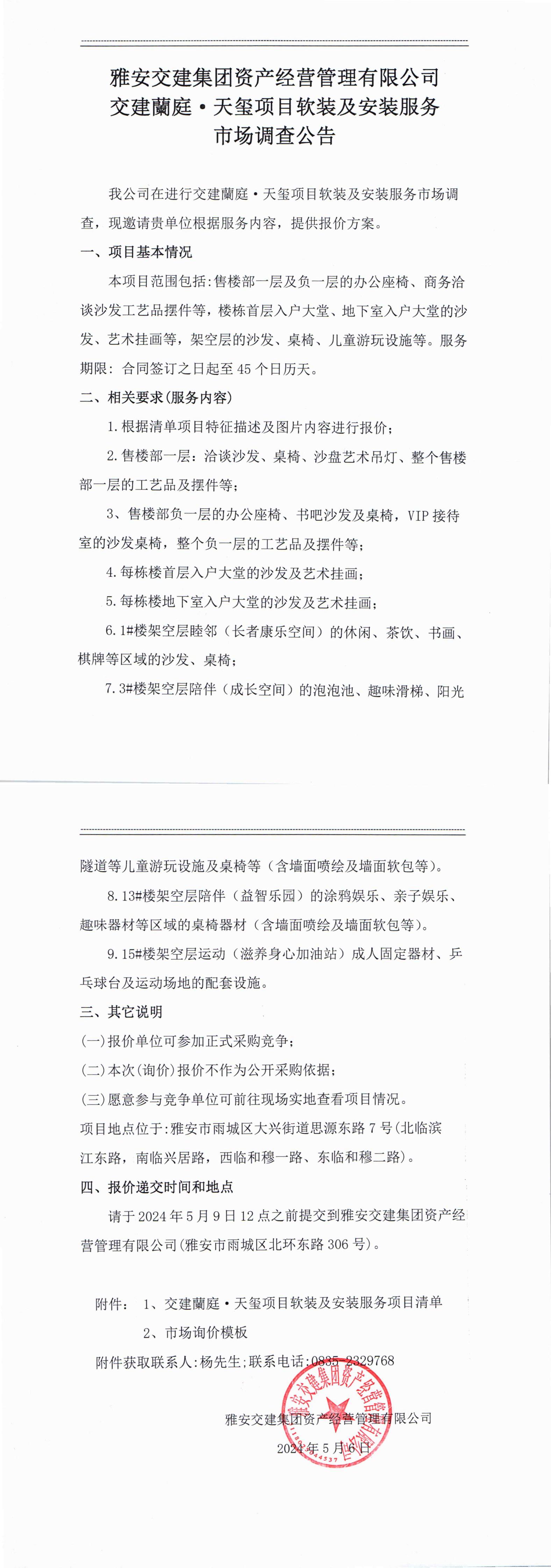 雅安交建集團資產經營管理有限公司交建蘭庭·天璽項目軟裝及安裝服務市場調查公告