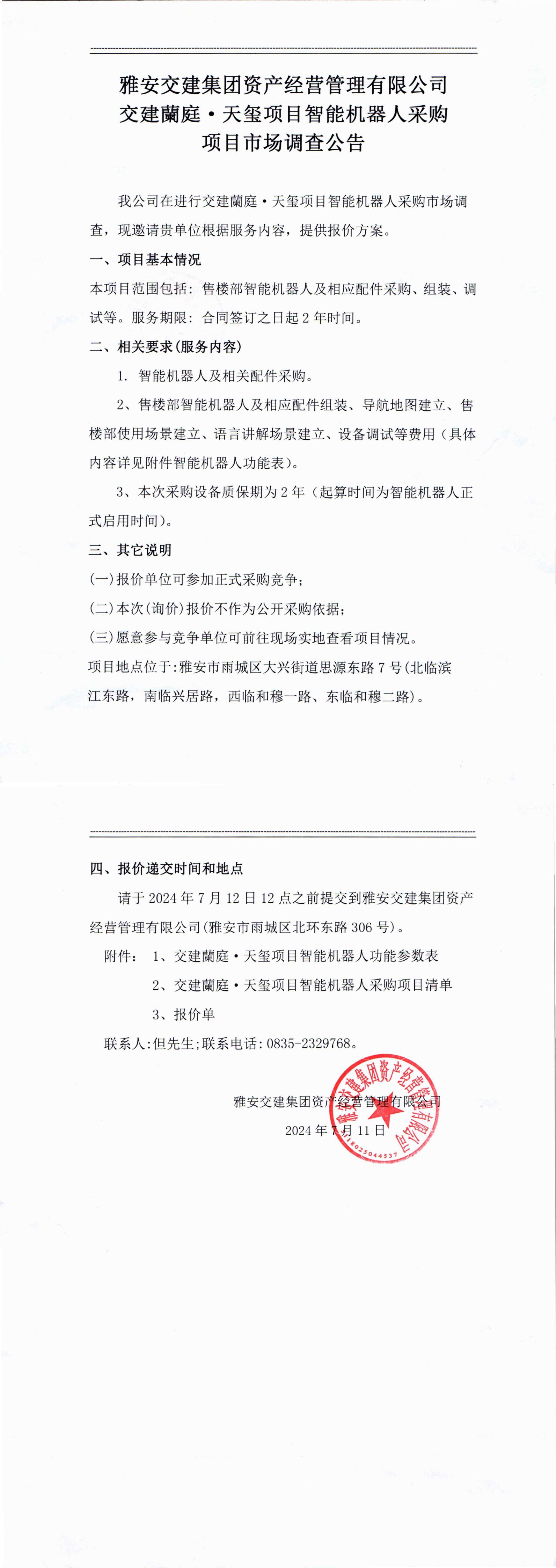 雅安交集團資產(chǎn)經(jīng)營管理有限公司交建蘭庭·天璽項目智能機器人采購項目市場調查公告