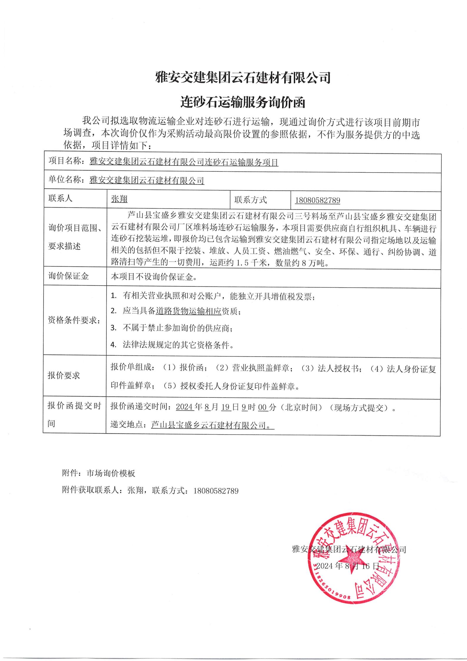 雅安交建集團云石建材有限公司連砂石運輸服務(wù)詢價函