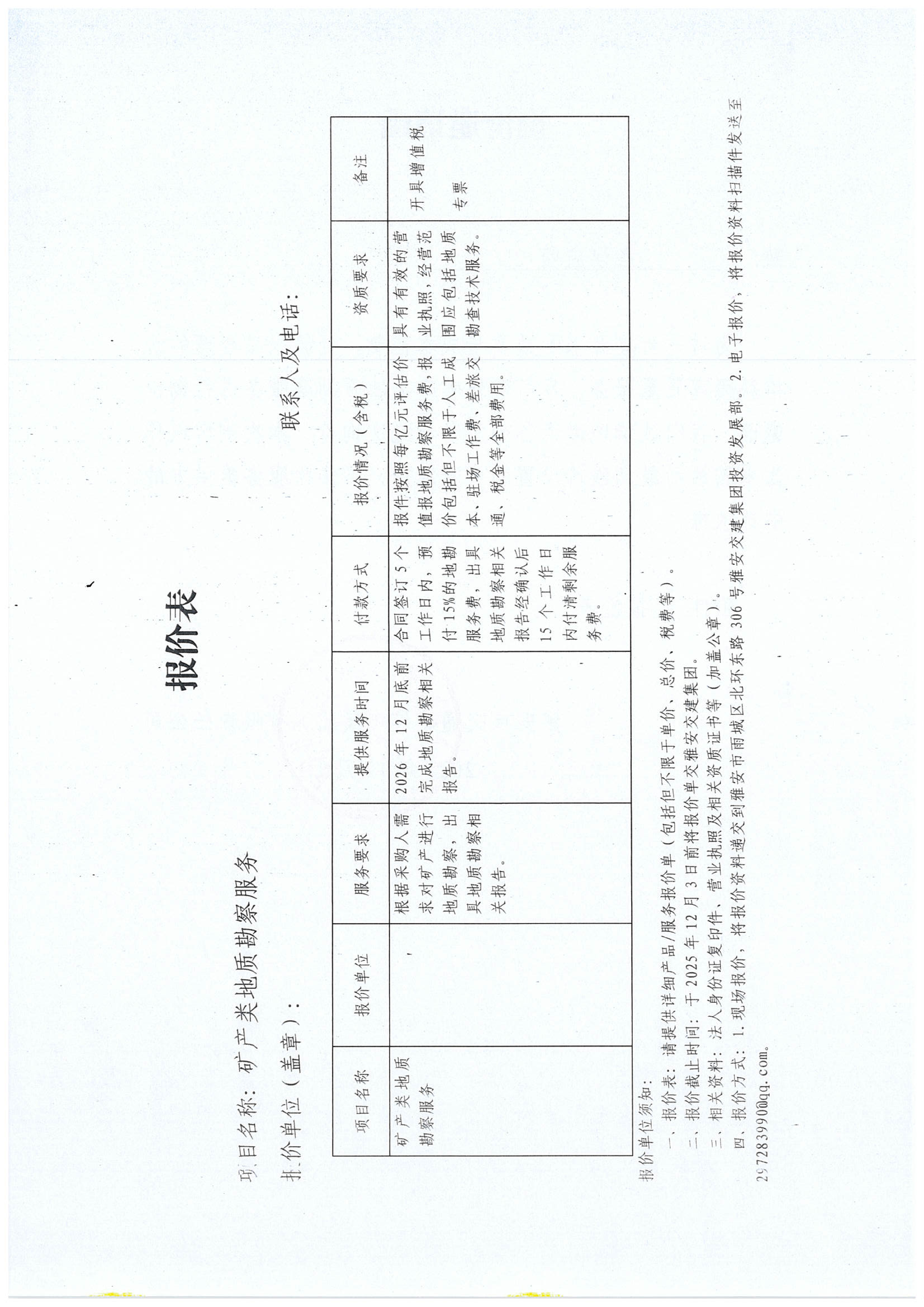 關(guān)于雅安市交通建設(shè)(集團)有限責(zé)任公司礦產(chǎn)類地質(zhì)勘察服務(wù)限價的詢價函