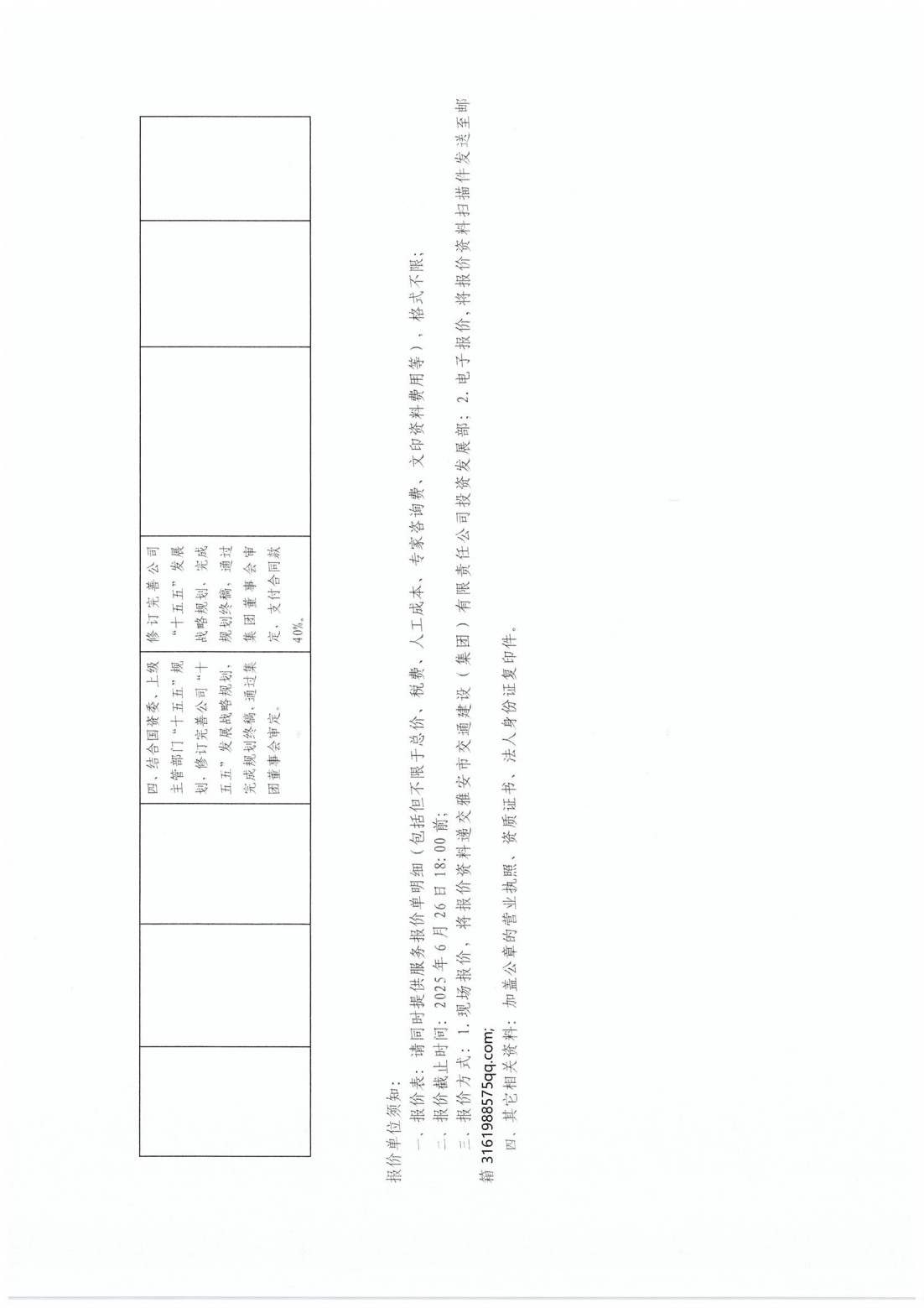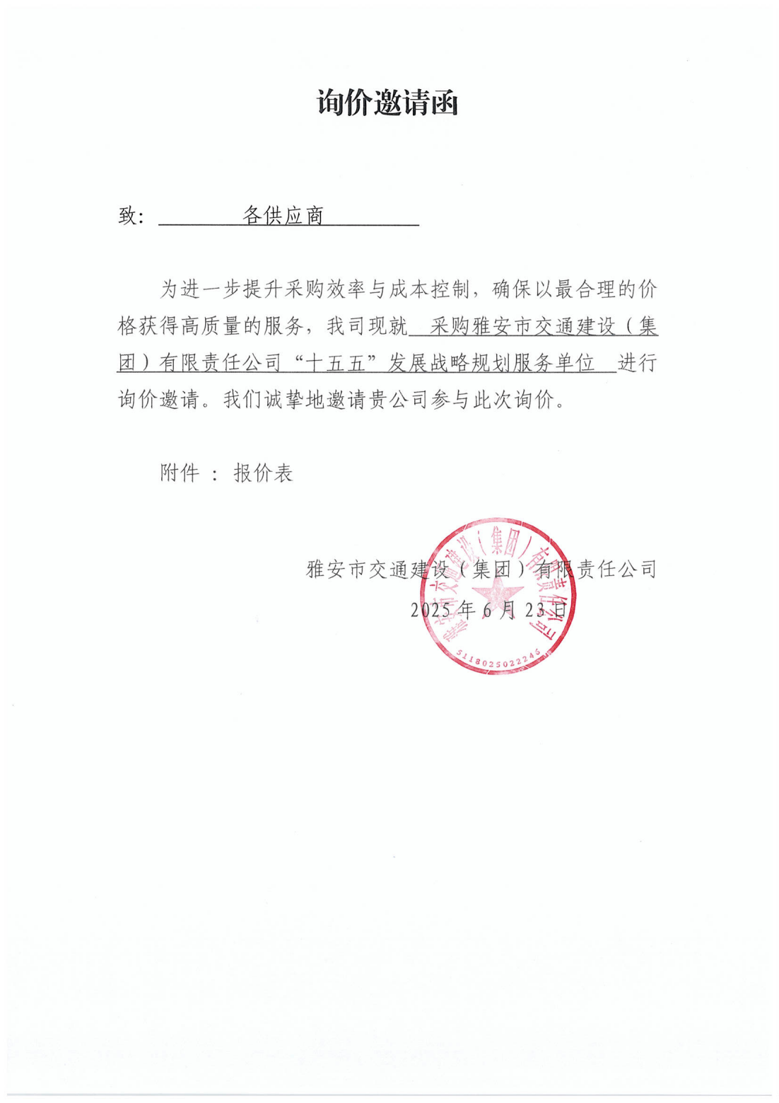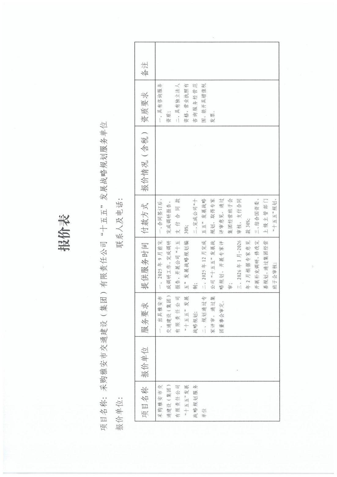 關(guān)于采購雅安市交通建設(shè)(集團(tuán))有限責(zé)任公司“十五五”發(fā)展戰(zhàn)略規(guī)劃服務(wù)單位的詢價(jià)