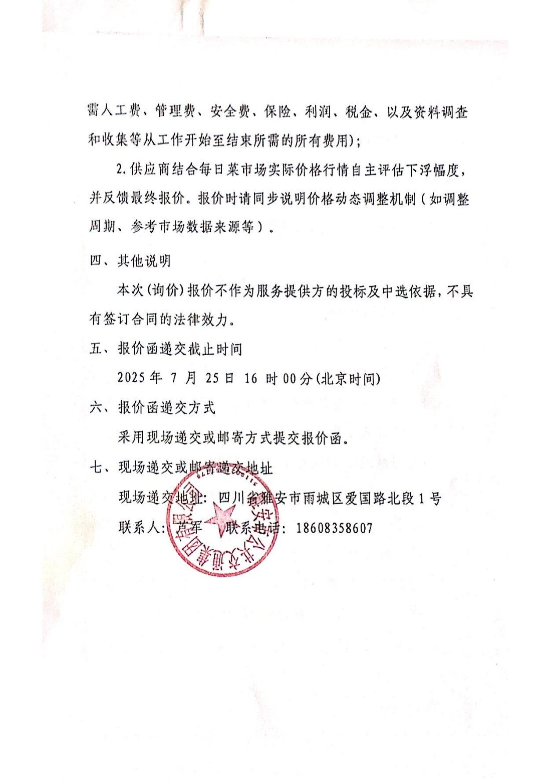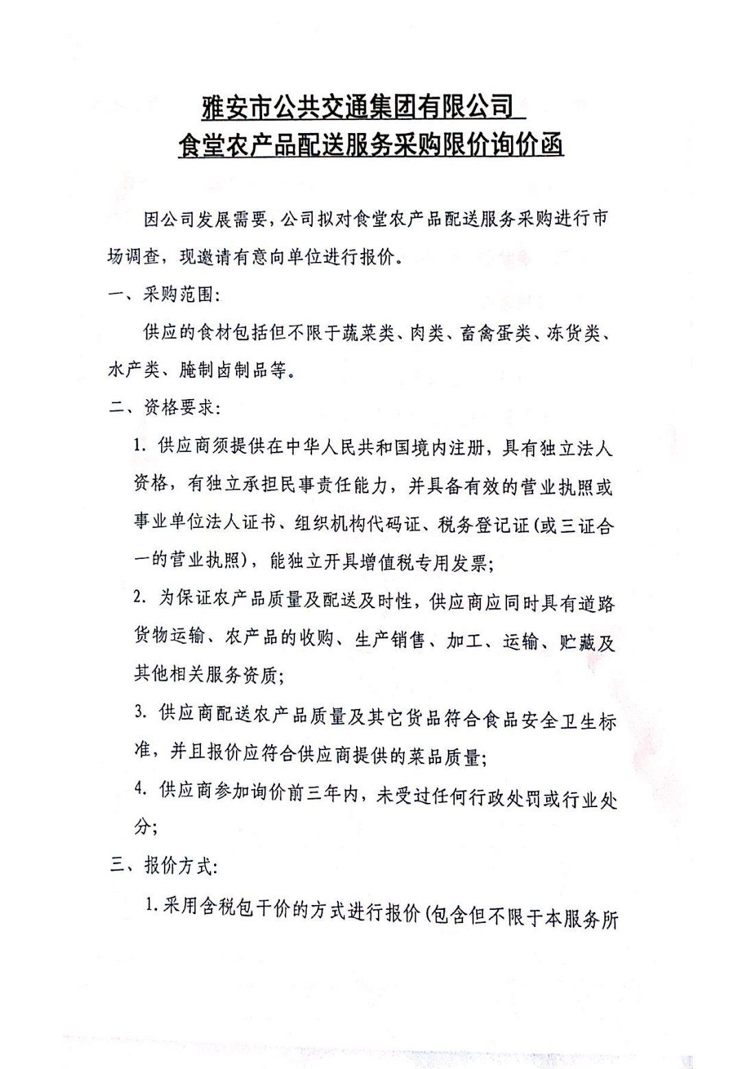 關(guān)于雅安市公共交通集團(tuán)有限公司食堂農(nóng)產(chǎn)品配送服務(wù)采購限價的詢價函