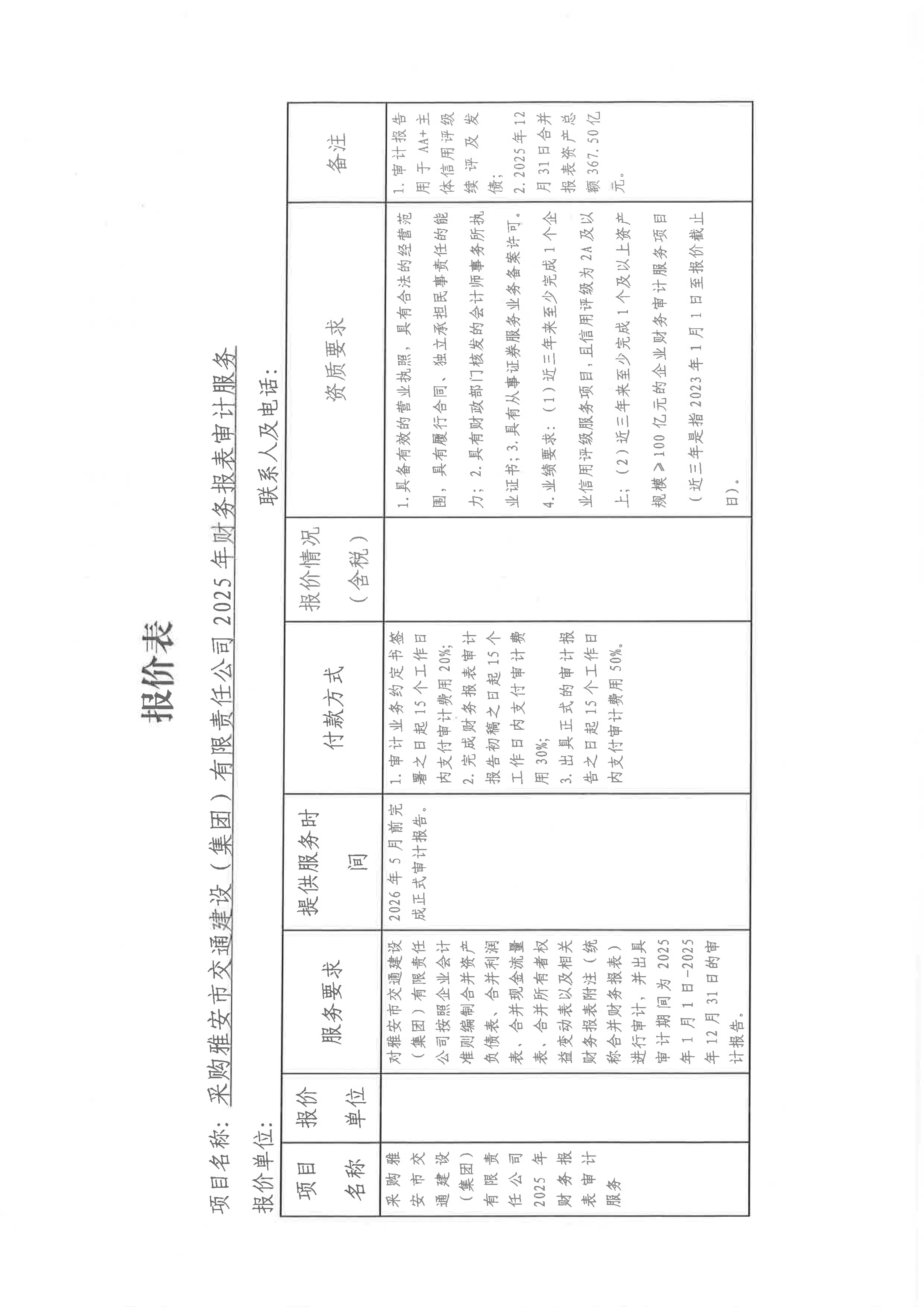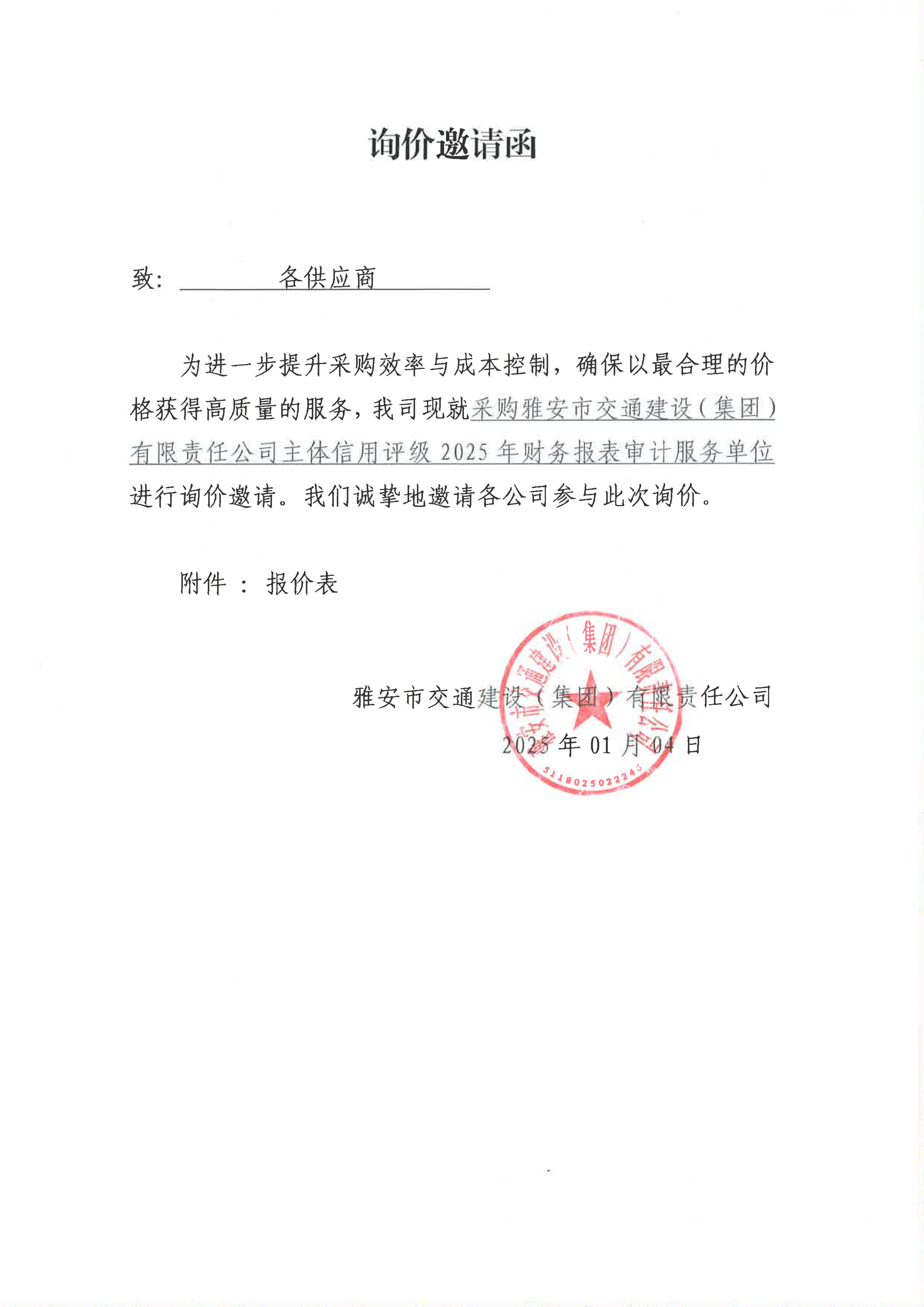 關(guān)于采購雅安市交通建設(shè)(集團)有限責任公司主體信用評級2025年財務(wù)報表審計服務(wù)限價的詢價函