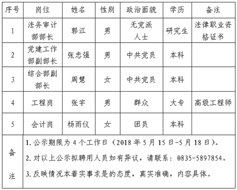 經(jīng)雅安市交通建設(shè)集團(tuán)有限責(zé)任公司研究,對(duì)以下5名擬聘用人員予以公示: