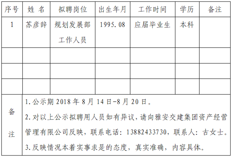 通過公開報名、資格審查、筆試、面試等程序,經(jīng)雅安交建集團資產(chǎn)經(jīng)營管理有限公司研究擇優(yōu)確定以下