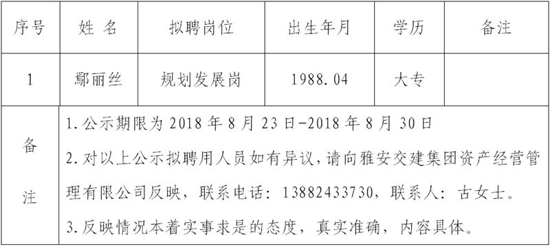 通過公開報名、資格審查、綜合測試等程序,經雅安交建集團資產經營管理有限公司研究確定以下1名擬聘用人員,現(xiàn)公示名單如下: