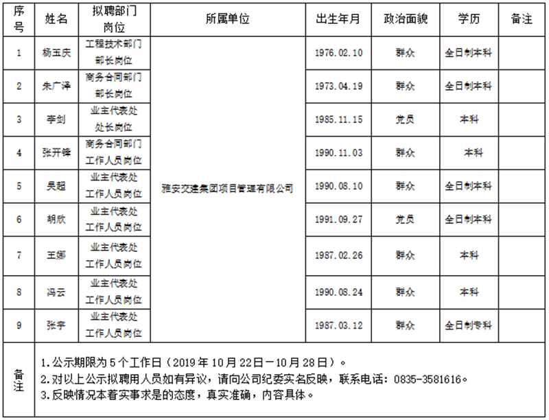 雅安交建集團(tuán)項(xiàng)目管理有限公司擬聘用人員公示(項(xiàng)目管理公司)