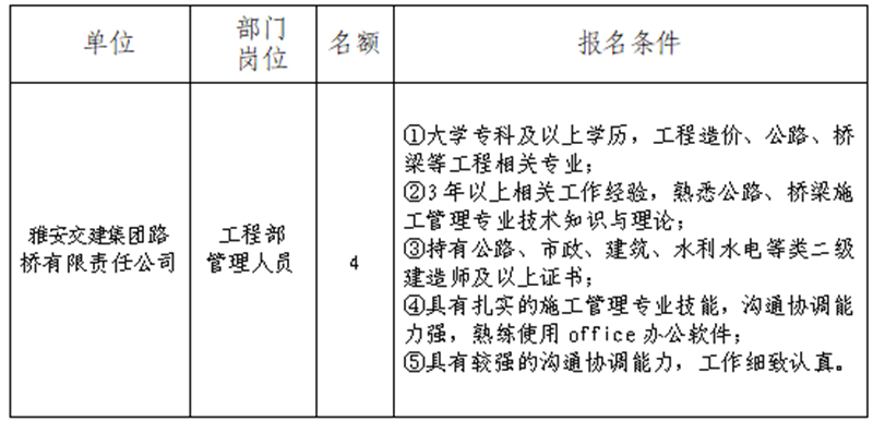 根據(jù)發(fā)展需要,決定面向社會公開招聘雅安市交通建設(shè)(集團)有限責任公司(以下簡稱“雅安交建集團”)所屬子公司工作人員4名,現(xiàn)將有關(guān)事項公告如下: