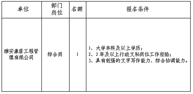 根據發(fā)展需要,決定面向社會公開招聘雅安市交通建設(集團)有限責任公司(以下簡稱“雅安交建集團”)所屬子公司工作人員1名,現將有關事項公告如下:
