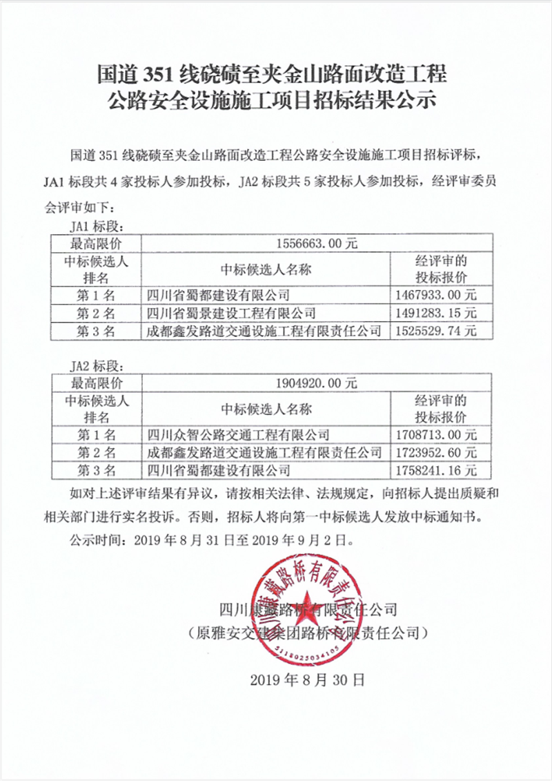 國道351線磽磧至夾金山路面改造工程公路安全設(shè)施施工項(xiàng)目招標(biāo)結(jié)果公示
