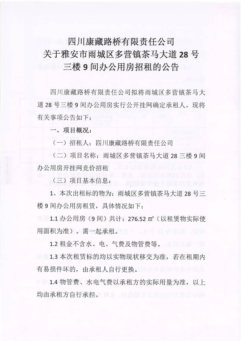 四川康藏路橋有限責任公司關于雅安市雨城區(qū)多營鎮(zhèn)茶馬大道28號三樓9間辦公用房招租的公告