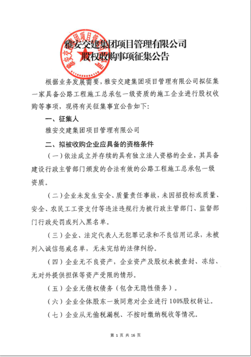 交建集團項目公司股權(quán)并購事項征集公告