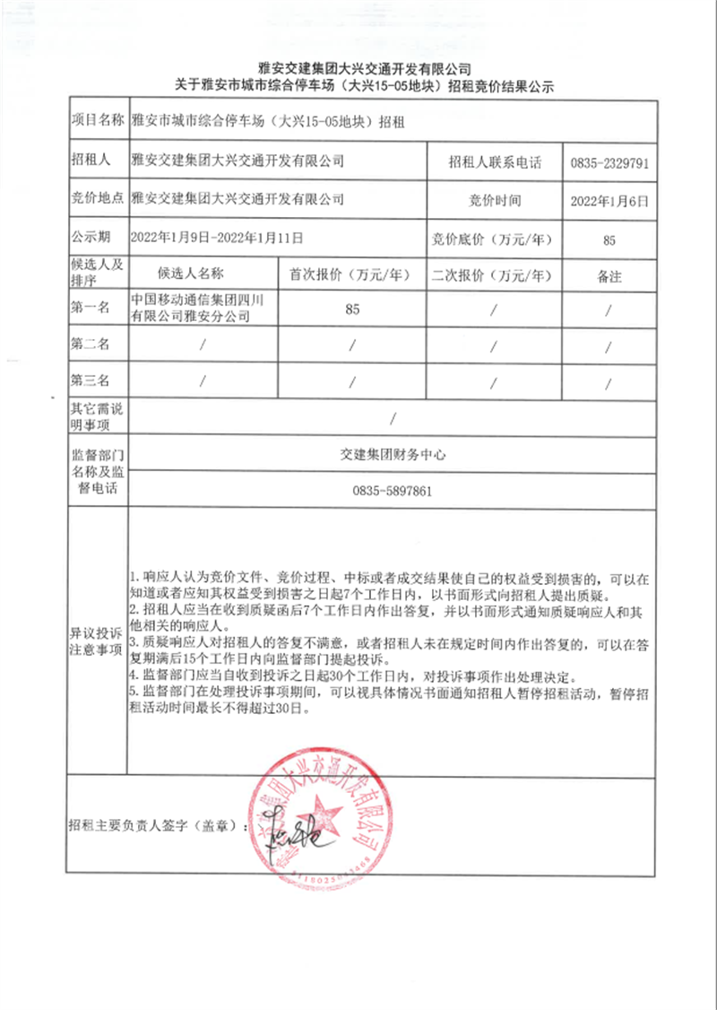 大興開發(fā)公司關(guān)于雅安市城市綜合停車場(大興15-05地塊)招租競價(jià)結(jié)果的公示