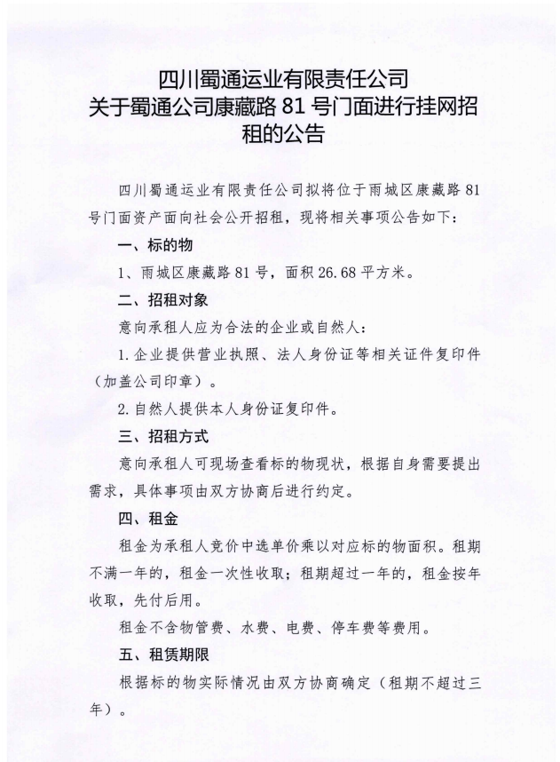 四川蜀通運(yùn)業(yè)有限責(zé)任公司關(guān)于蜀通公司康藏路81號(hào)門面進(jìn)行掛網(wǎng)招租的公告:附件