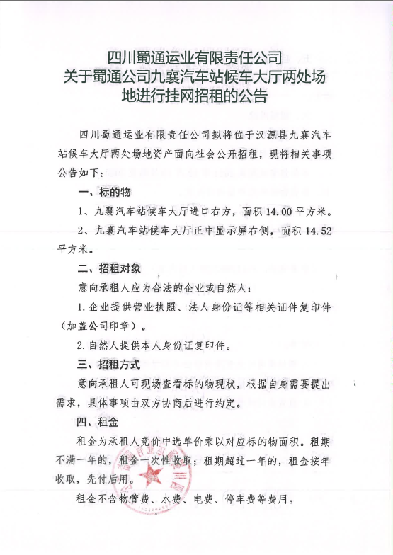 四川蜀通運(yùn)業(yè)有限責(zé)任公司關(guān)于蜀通公司九襄汽車站候車大廳兩處場(chǎng)地進(jìn)行掛網(wǎng)招租的公告