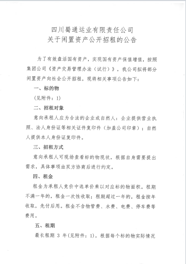 蜀通運業(yè)有限責任公司關(guān)于閑置資產(chǎn)公開招租的公告附件