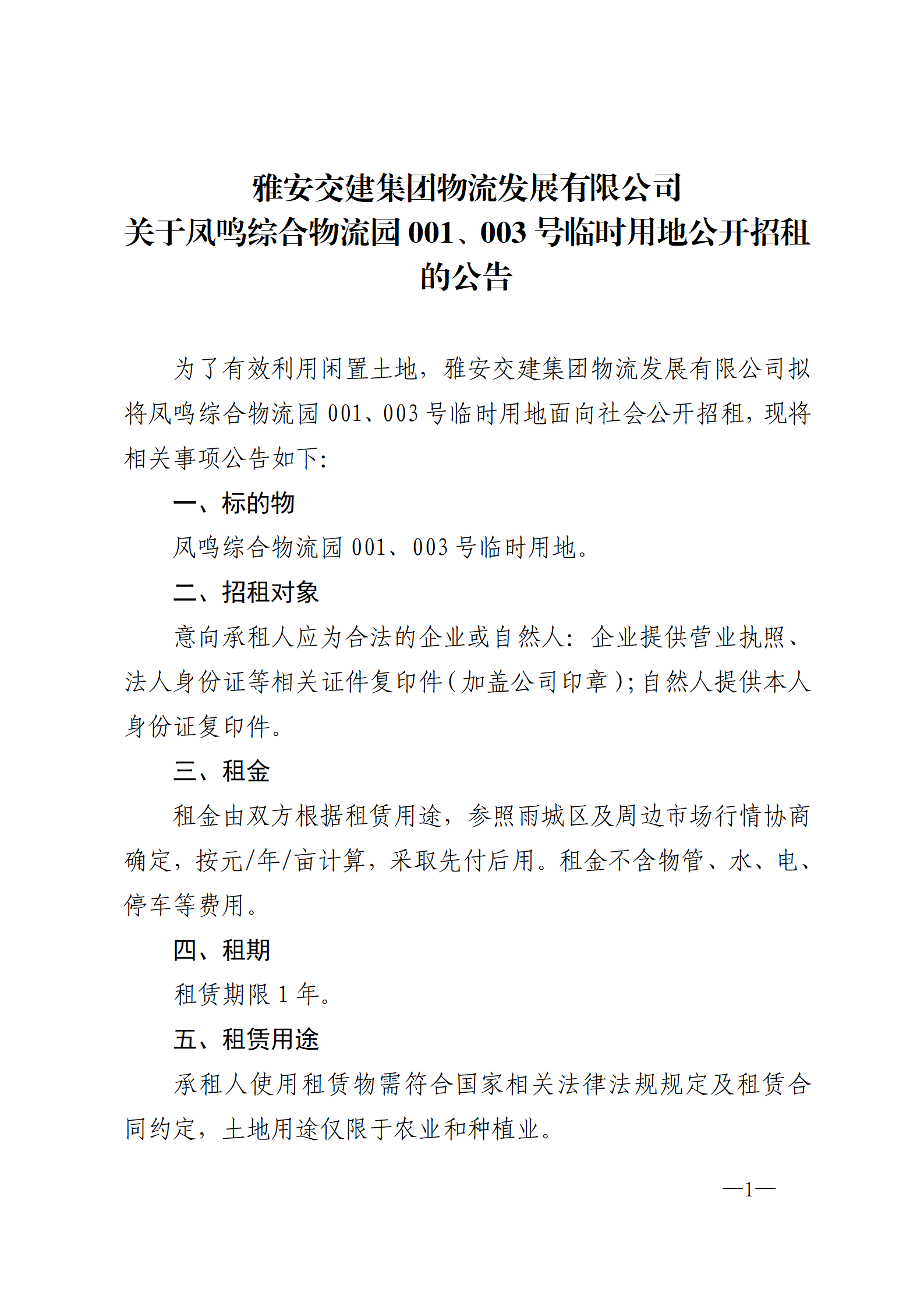 雅安交建集團(tuán)物流發(fā)展有限公司 關(guān)于鳳鳴綜合物流園001、003號臨時用地公開招租的公告