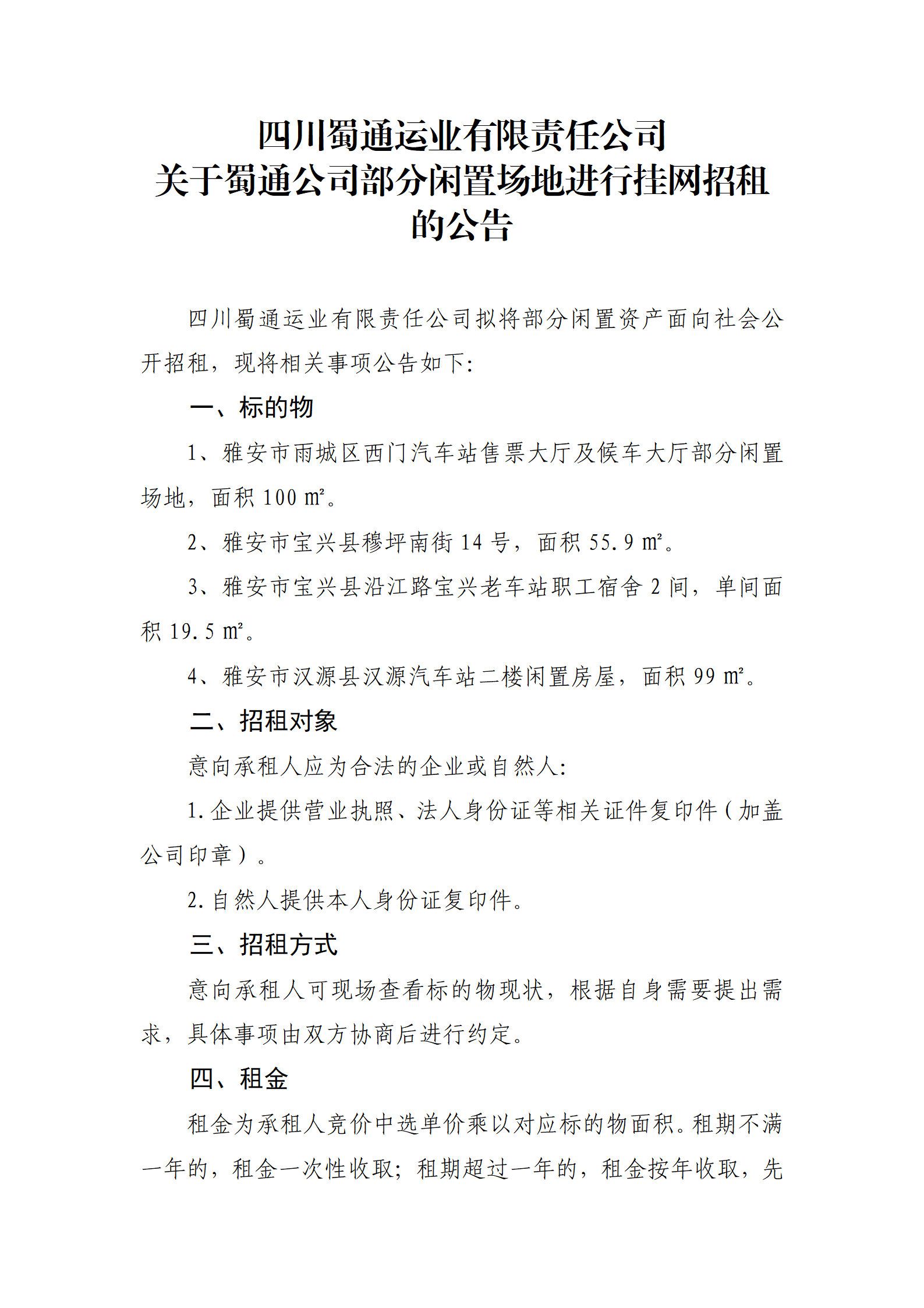 四川蜀通運業(yè)有限責任公司 關(guān)于蜀通公司部分閑置場地進行掛網(wǎng)招租的公告