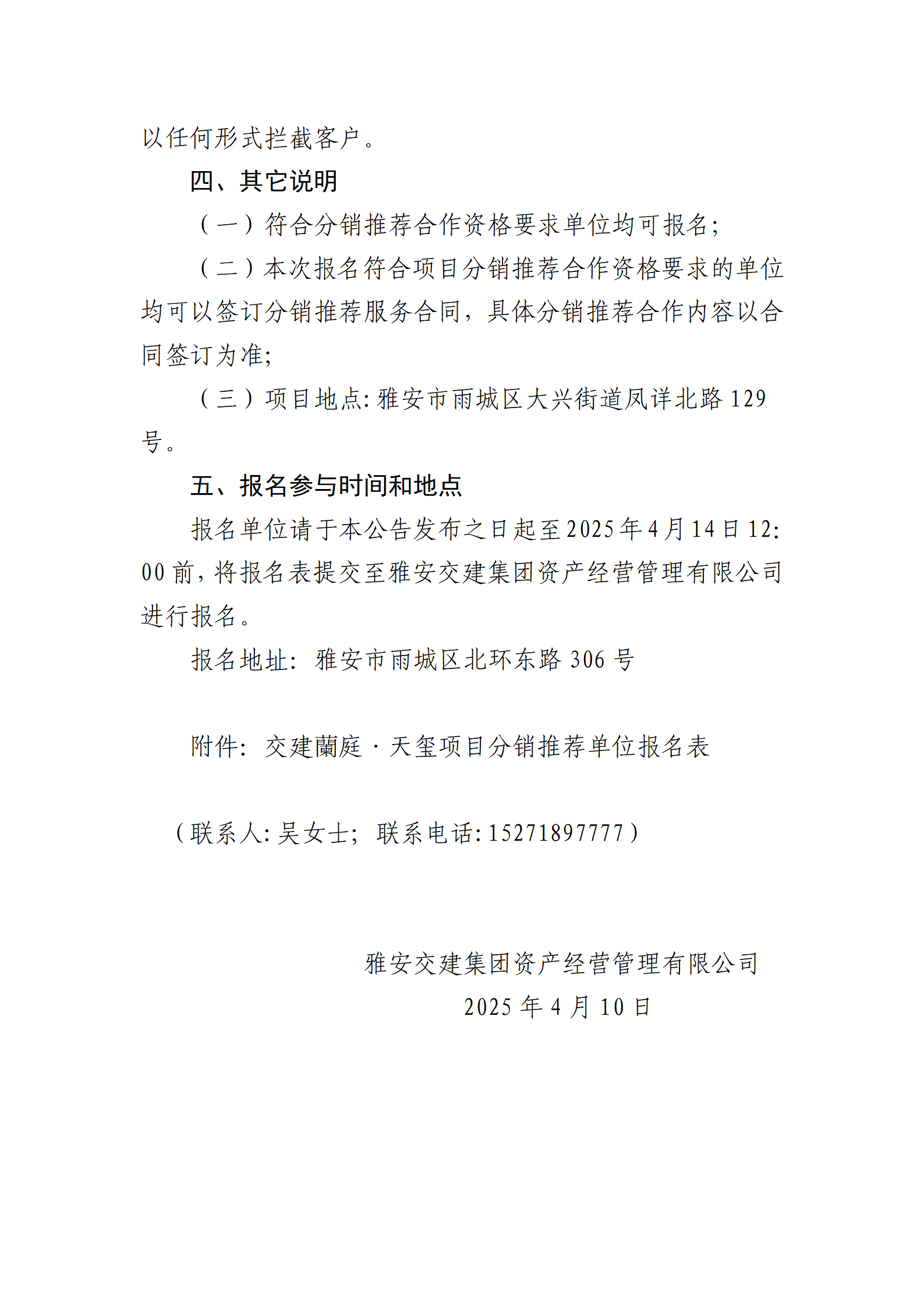雅安交建集團(tuán)資產(chǎn)經(jīng)營管理有限公司 關(guān)于征集蘭庭·天璽項(xiàng)目分銷推薦合作單位的公告