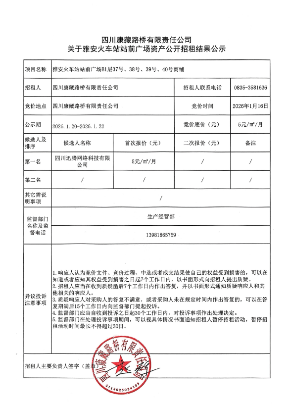 四川康藏路橋有限責(zé)任公司關(guān)于雅安火車站站前廣場(chǎng)資產(chǎn)公開招租結(jié)果公示