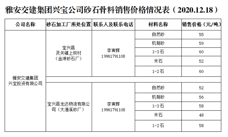 雅安交建集團(tuán)興寶公司砂石骨料銷售價(jià)格情況表(2020.12.18)