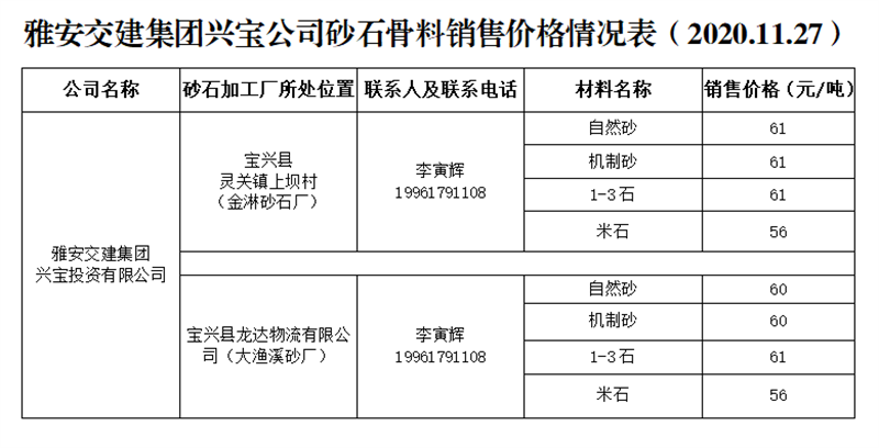 雅安交建集團(tuán)興寶公司砂石骨料銷售價格情況表(2020.11.27)