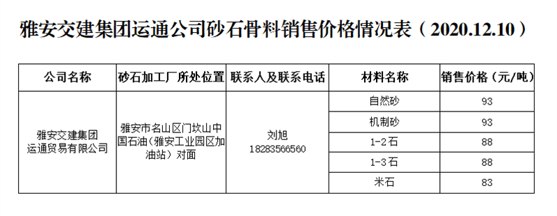 雅安交建集團(tuán)運通公司砂石骨料銷售價格情況表(2020.12.10)