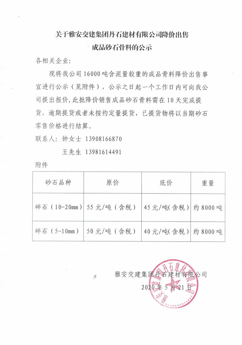 關(guān)于雅安交建集團(tuán)丹石建材有限公司降價(jià)出售 成品砂石骨料的公示