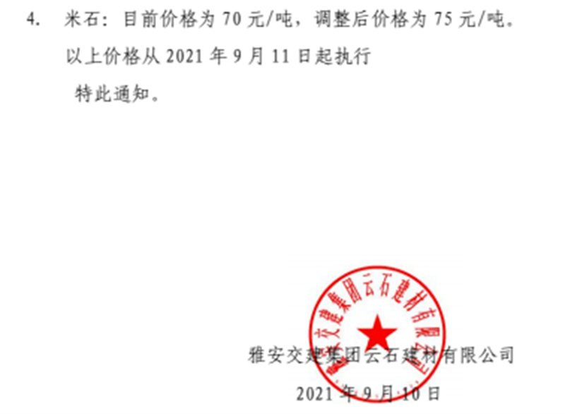 雅安交建集團云石公司關于調(diào)整成品料銷售價格的通知(2021.11.4)