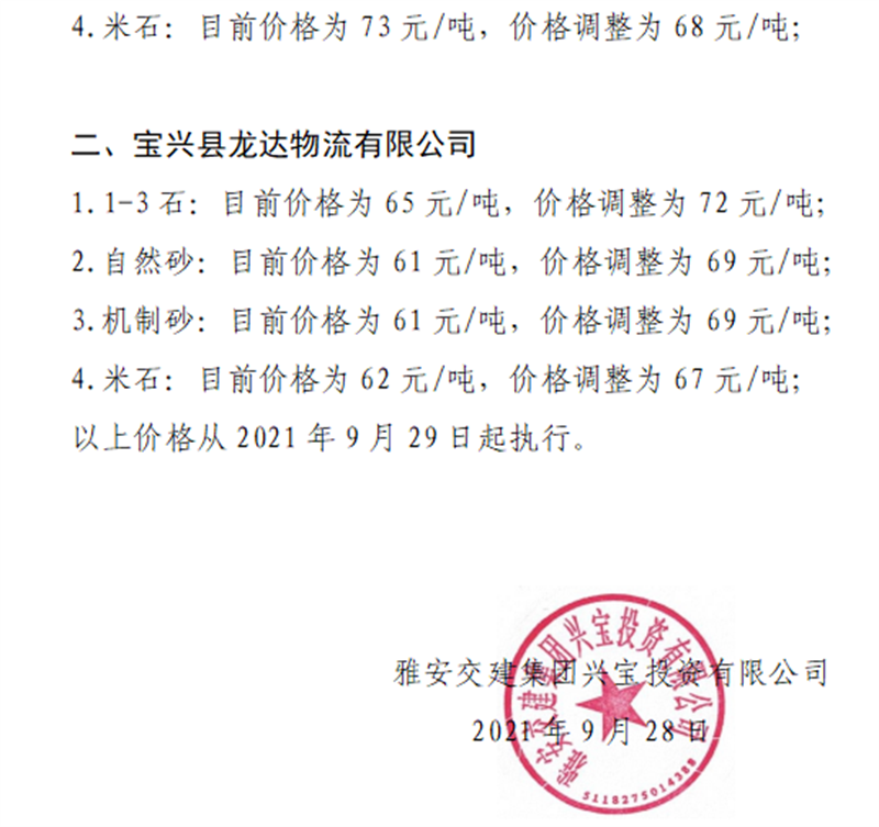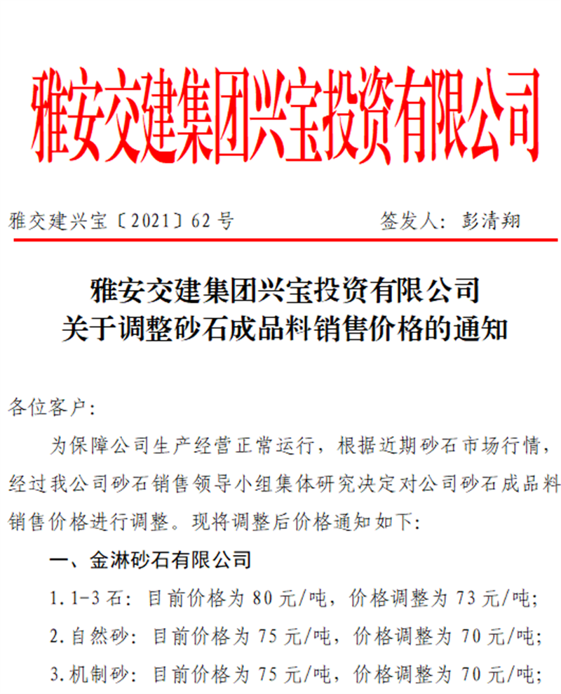 雅安交建集團(tuán)興寶公司關(guān)于調(diào)整砂石成品料銷售價(jià)格的通知(2021.9.28)