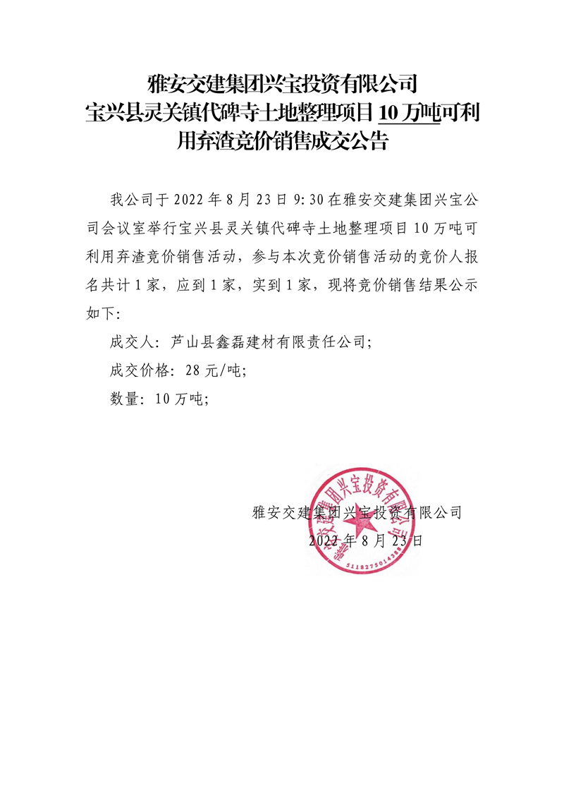 雅安交建集團(tuán)興寶投資有限公司寶興縣靈關(guān)鎮(zhèn)代碑寺土地整理項(xiàng)目10萬(wàn)噸可利用棄渣競(jìng)價(jià)銷售成交公告(8.23)