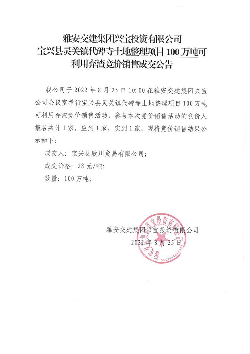雅安交建集團興寶投資有限公司寶興縣靈關(guān)鎮(zhèn)代碑寺土地整理項目5萬噸可利用棄渣競價銷售成交公告(8.23)