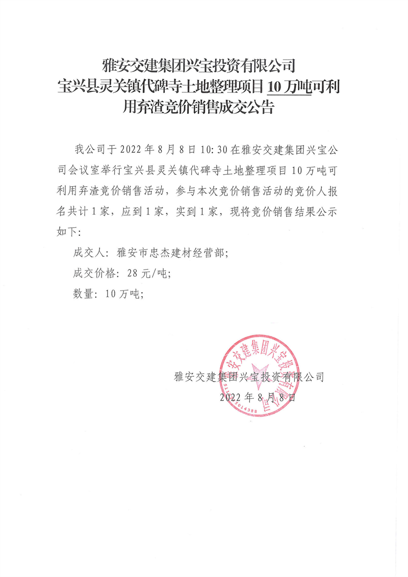代碑寺土地整理項目100萬噸可利用棄渣競價銷售成交公告