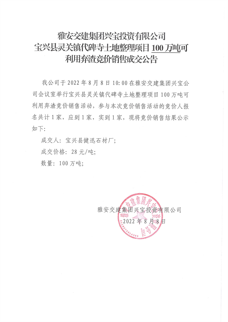 代碑寺土地整理項(xiàng)目100萬噸可利用棄渣競(jìng)價(jià)銷售成交公告
