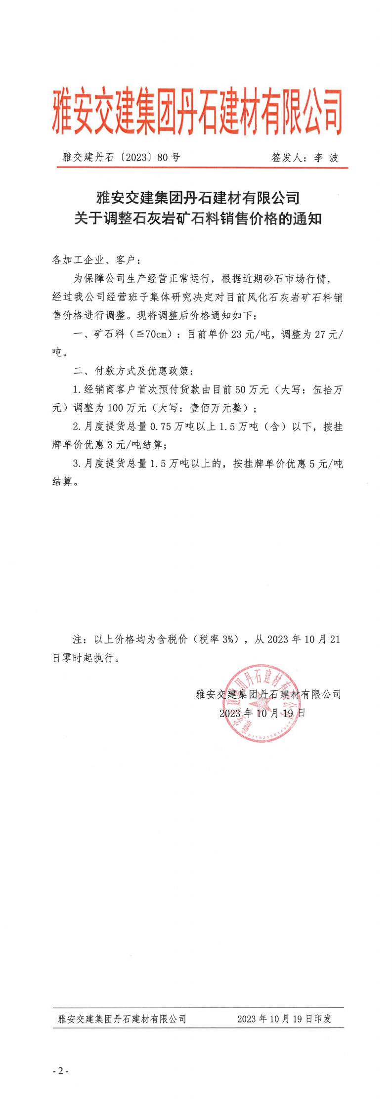 ÑŰ²½»½¨µ¤Ê¯¹«Ë¾êP(gu¨¡n)ÓÚʯ»Ò?gu¨©)rµVʯÁÏÕ{(di¨¤o)ƒrµÄ֪ͨ--2023.10.20