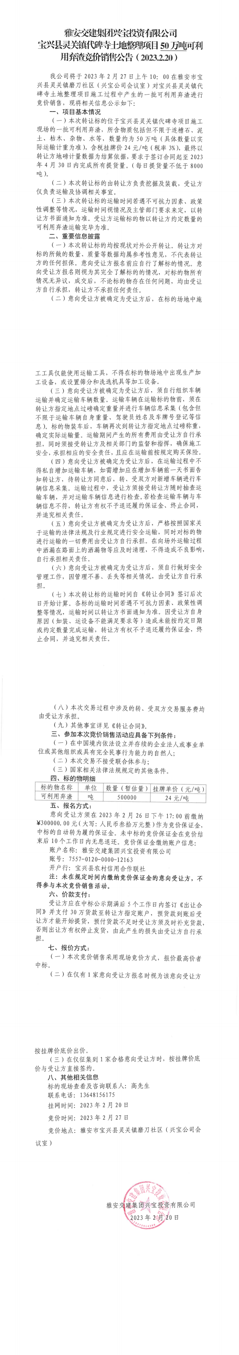 雅安交建集團(tuán)興寶投資有限公司靈關(guān)鎮(zhèn)代碑寺土地整理項(xiàng)目50萬(wàn)噸可利用棄渣競(jìng)價(jià)銷售公告(2023.2.20)、