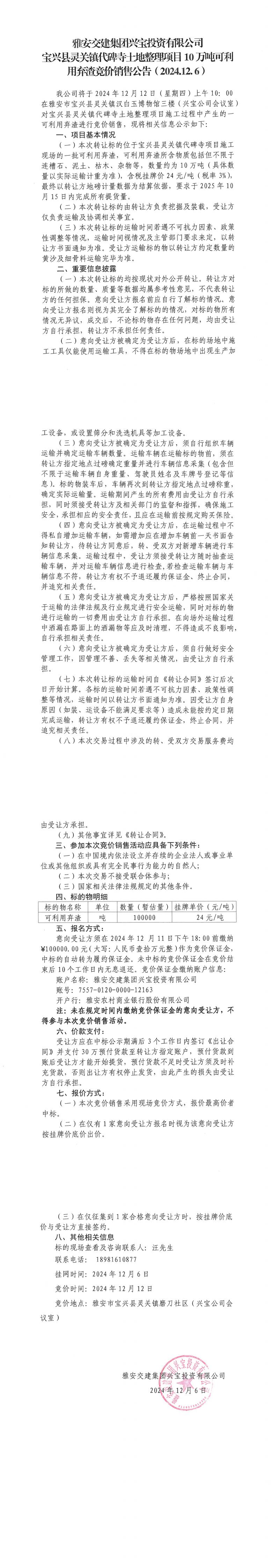 雅安交建集團(tuán)興寶投資有限公司靈關(guān)鎮(zhèn)代碑寺土地整理項(xiàng)目10萬噸可利用棄渣競(jìng)價(jià)銷售公告(2024.12.06)