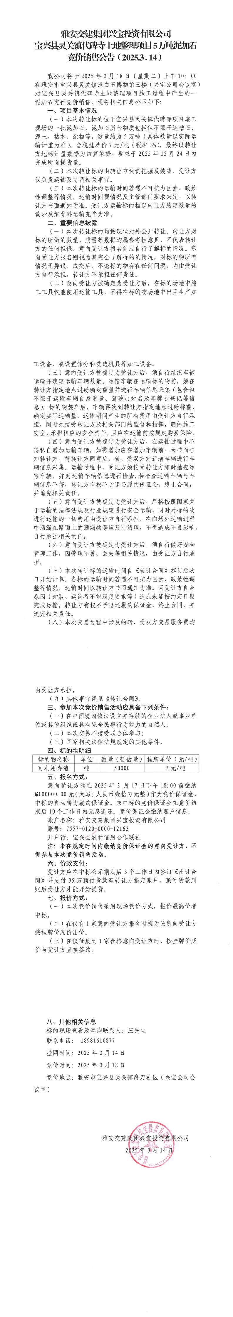 雅安交建集團(tuán)興寶投資有限公司寶興縣靈關(guān)鎮(zhèn)代碑寺土地整理項(xiàng)目5萬噸泥加石競(jìng)價(jià)銷售公告(2025.03.14)